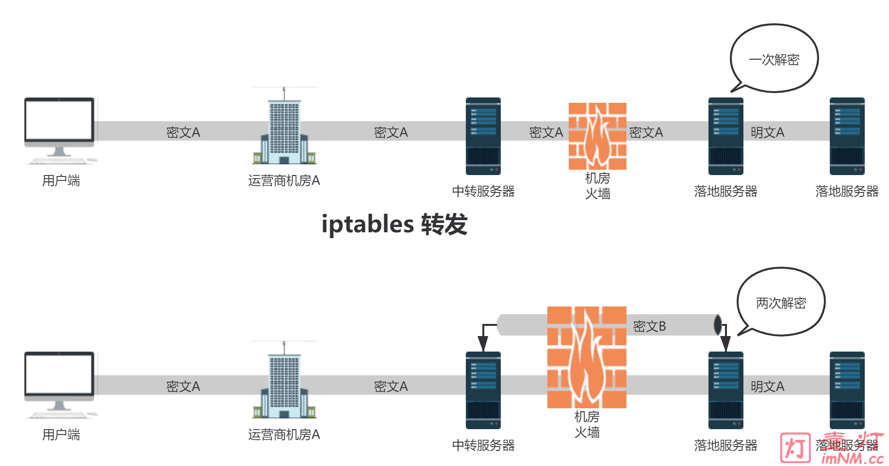 隧道中转 与 iptables 等流量转发的区别:一般情况下,我们所接触到的中转服务器大体是使用 iptables 或者 socat 等工具,直接转发数据包(流量)到落地服务器。 在这种转发方式中,中转服务器没有对数据包进行任何操作(如加密、混淆等),仅仅将数据包原封不动地转发到落地服务器。而隧道中转服务器会对数据包进行再次处理(如加密、混淆等)。如下图所示: